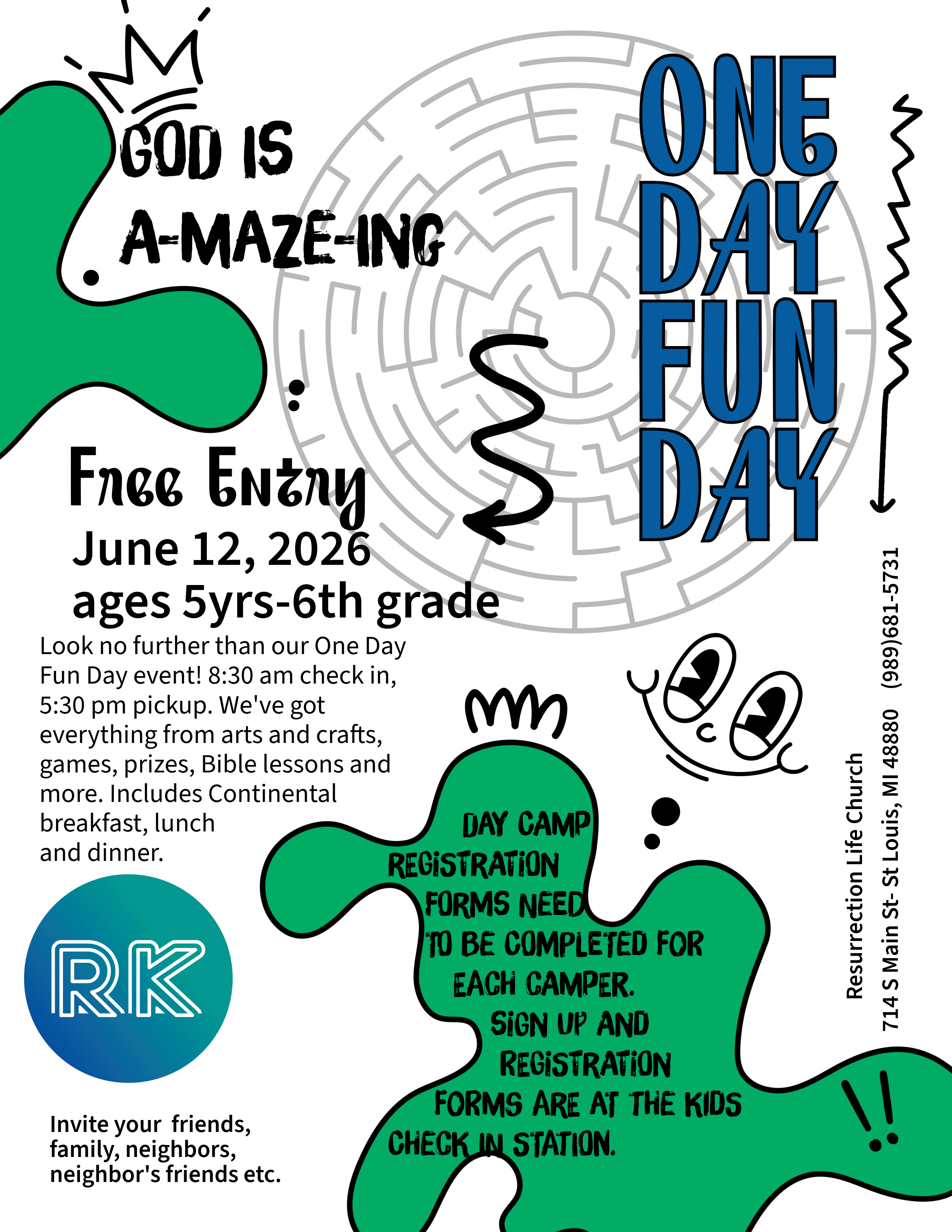 Our free One Day - Fun Day will be an all-day camp that Includes a continental breakfast, lunch, dinner, snacks, games, prizes, crafts, and our new playground, bible lessons and more! Free bus service is available.